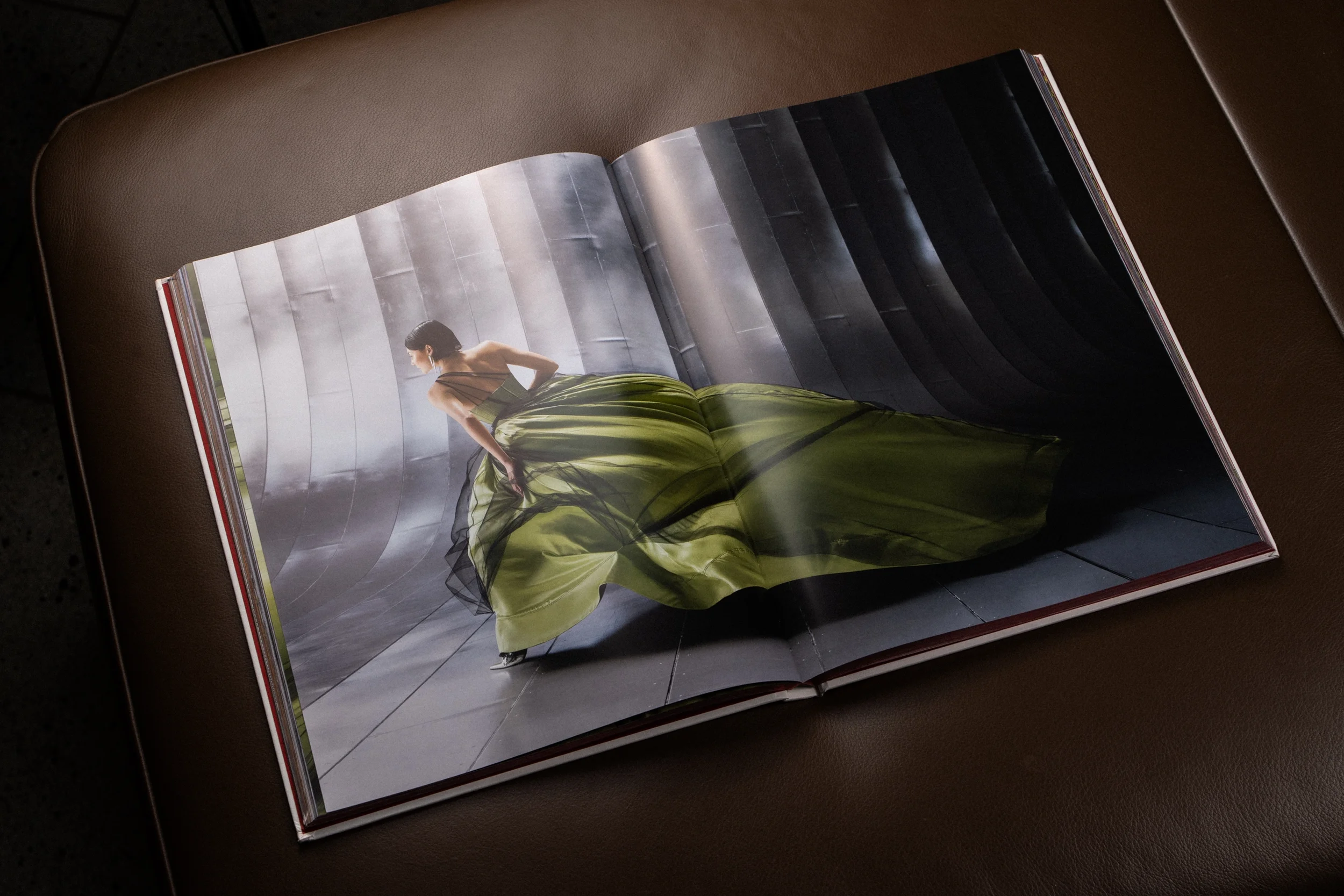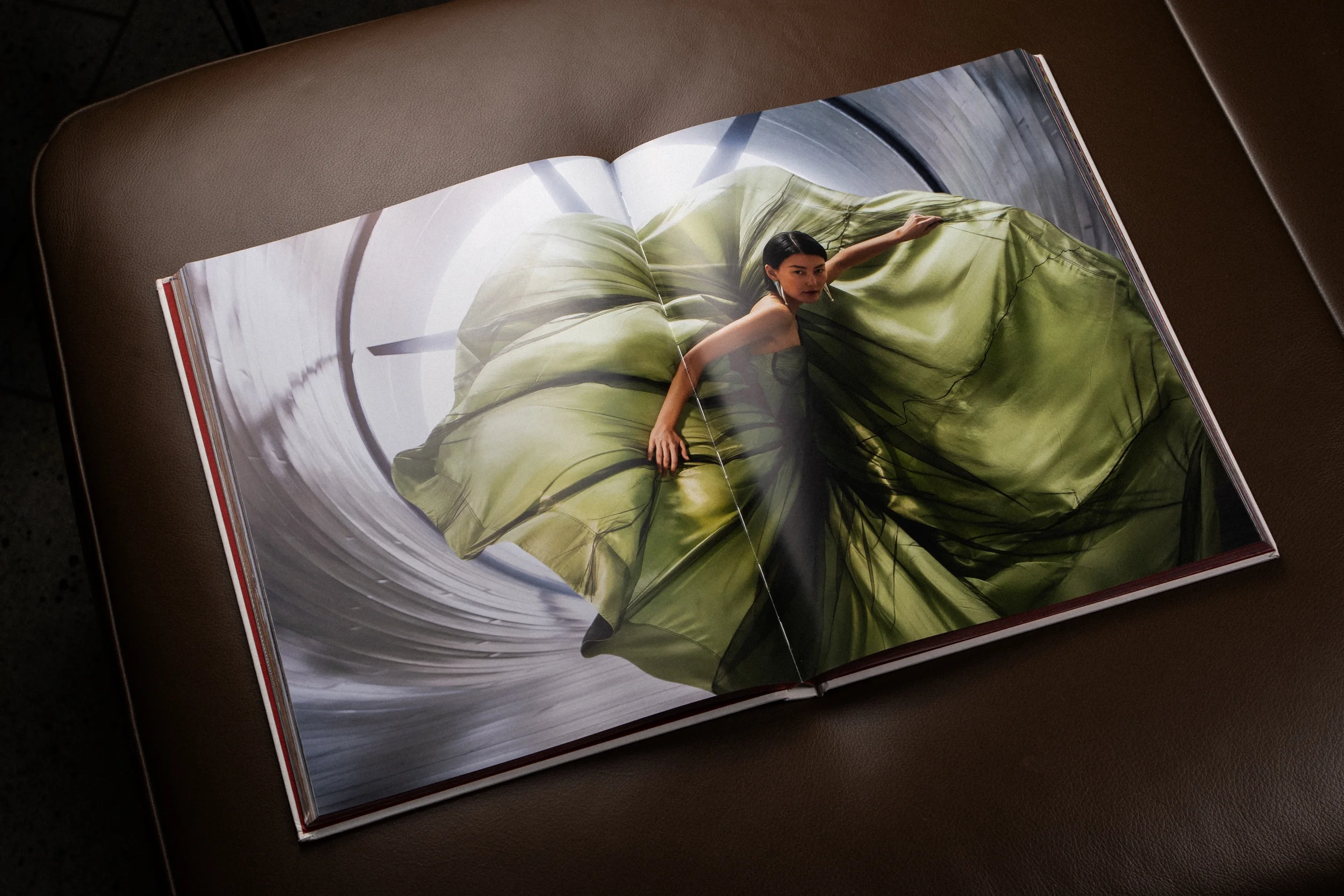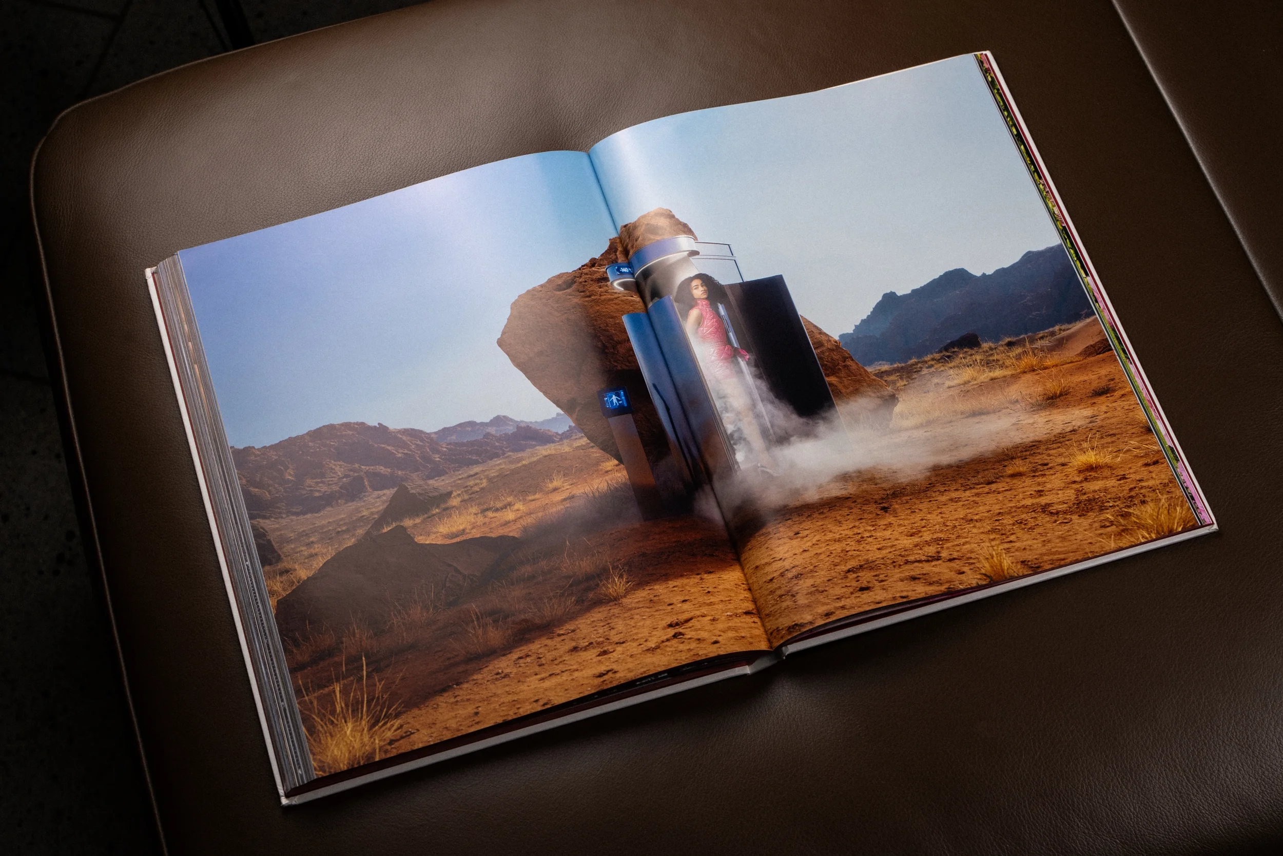 Real talent photographed on set was composited into these digital spaces, merging fashion photography with constructed worlds.